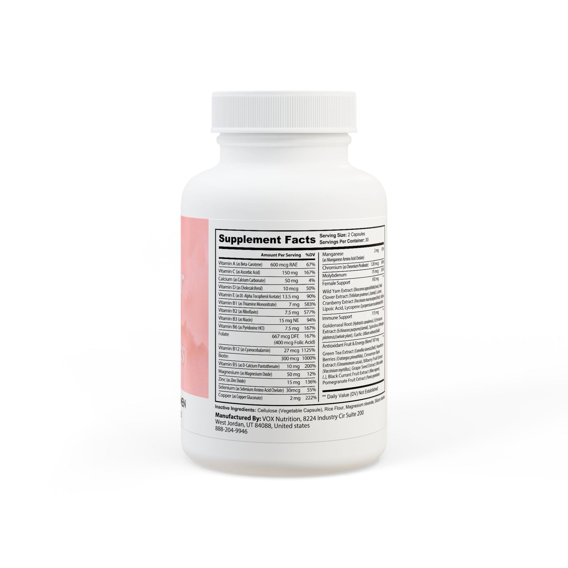 Key ingredients include Vitamin A, Vitamin C, Calcium, Vitamin D, Vitamin E, Vitamin B1, Vitamin B2, Vitamin B3, Vitamin B6, Folate, Vitamin B12, Biotin, Vitamin B5, Magnesium, Zinc, Selenium, Copper, Manganese, Chromium, Molybdenum, Wild Yam Extract, Red Clover Extract, Lutein, Cranberry Extract, Spirulina, Garlic, Green Tea Extract, Hawthorn Berries, Cinnamon Bark Extract, Grape Seed Extract, Black Currant Fruit Extract, and Pomegranate Fruit Extract.