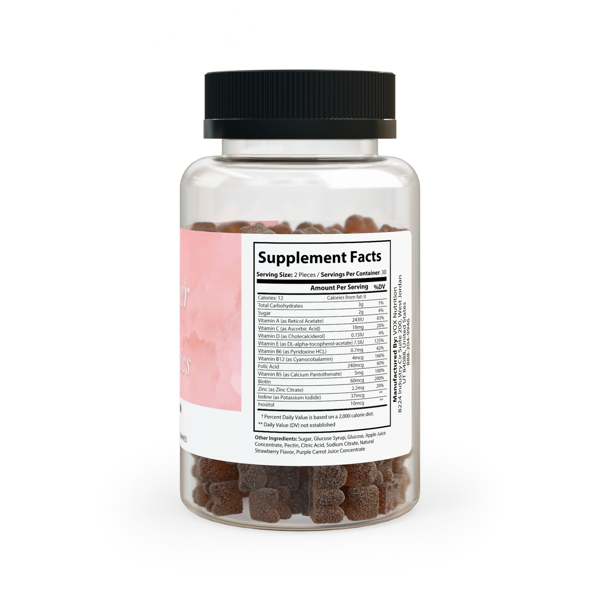 Ingredients: Vitamin A (as Reticol Acetate), Vitamin C (as Ascorbic Acid), Vitamin D (as Cholecalciderol), Vitamin E (as DL-alpha-tocopherol-acetate), Vitamin B6 (as Pyridoxine HCL), Vitamin B12 (as Cyanocobalamin), Folic Acid, Vitamin B5 (as Calcium Pantothenate), Biotin, Zinc (as Zinc Citrate), Iodine (as Potassium Iodide), Inositol. Other Ingredients: Sugar, Glucose Syrup, Glucose, Apple Juice Concentrate, Pectin, Citric Acid, Sodium Citrate, Natural Strawberry Flavor, Purple Carrot Juice Concentrate